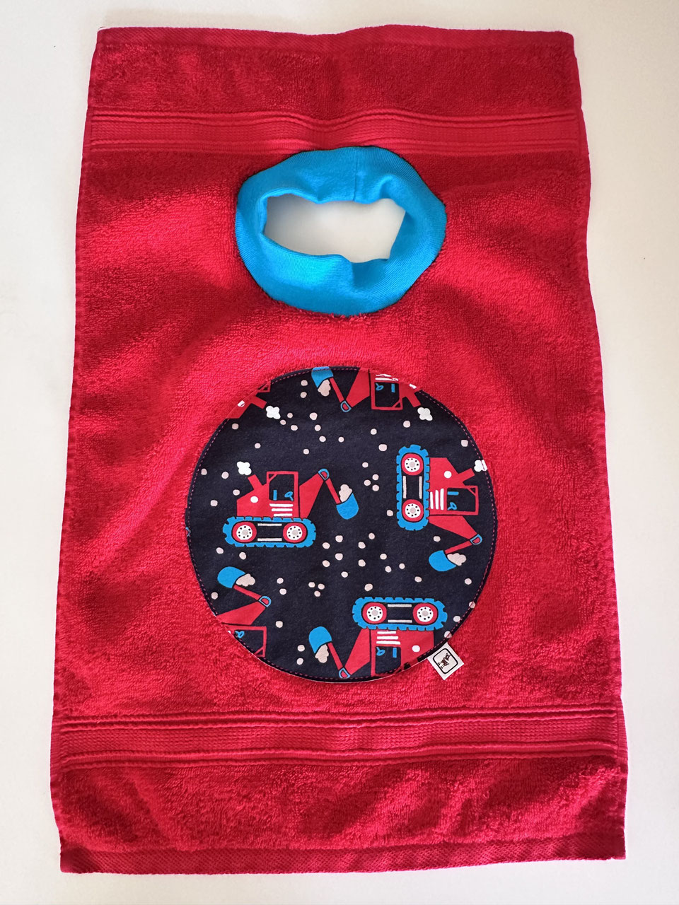 Toller grosser Latz aus Frotte. Durch die Grösse und die Saugfähigkeit vom Latz schützt er die Kleidung wunderbar. Durch das Schlupfloch können die Kinder bald den Latz alleine an- und ausziehen.